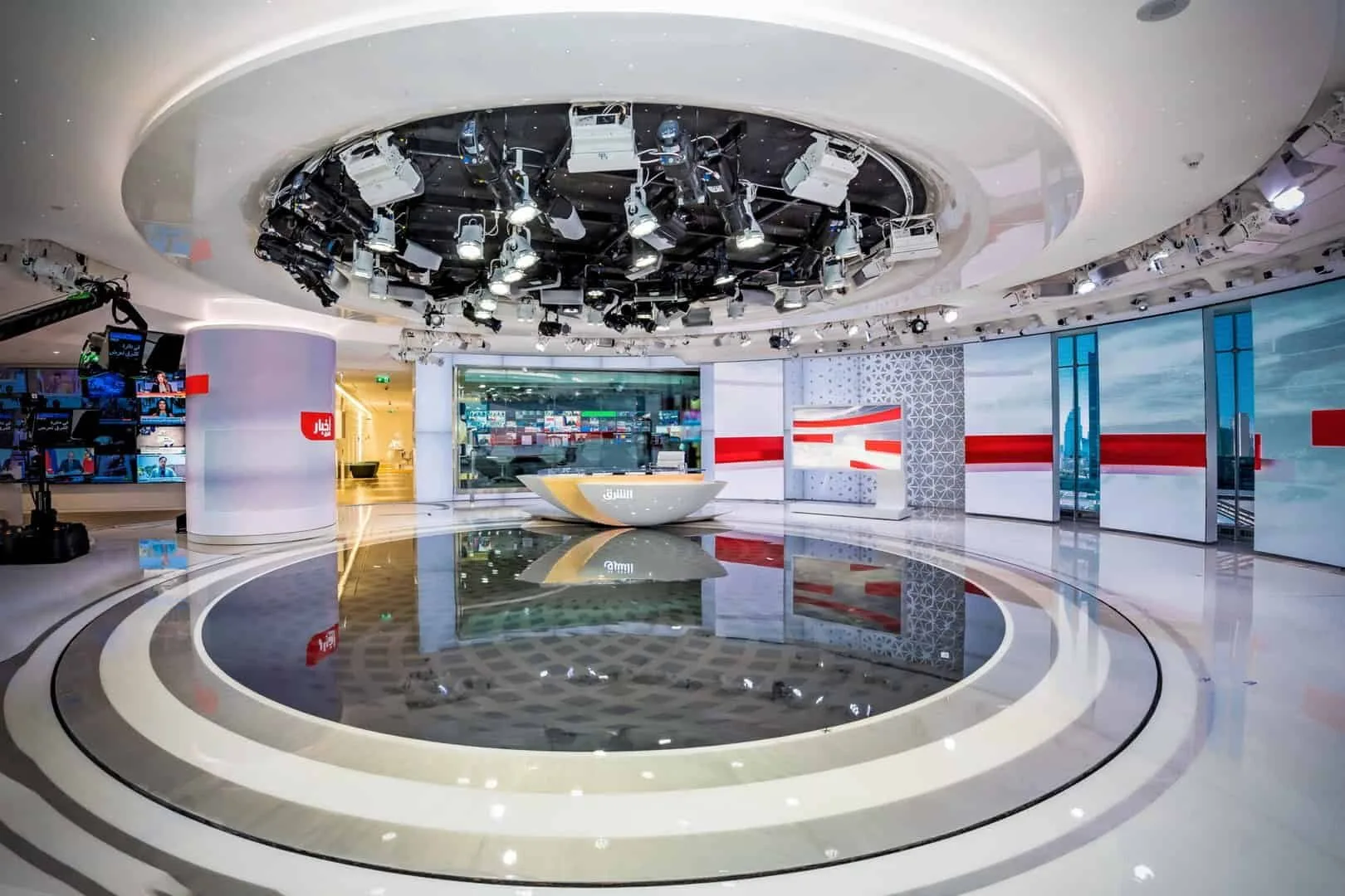 Asharq News has ambitious goals in every respect for the development of its media center. Asharq relied on a team of specialists consisting of an international firm of architects, local construction companies and the general contractor Qvest Media for all technology issues right from the design concept and space planning of the building. Hand in hand, a perfect symbiosis of modern interior and workplace design as well as functional spatial architecture was developed, embedding the editorial, creative and technological work into the set and studio design.